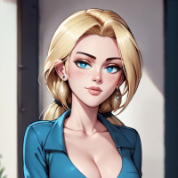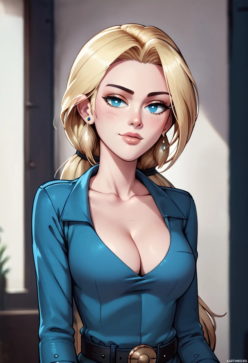 blonde hair. She has light-colored eyes and is wearing a blue top with
