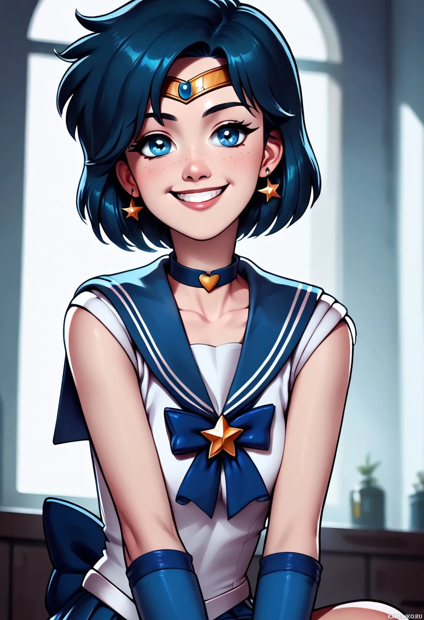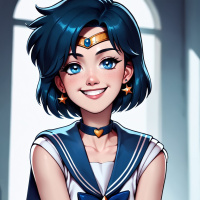 blue hair and is wearing a sailor-style outfit with a bow, which suggests she may be portraying a character from a popular Japanese animation known as "anime." The background is simple, featuring what appears to be