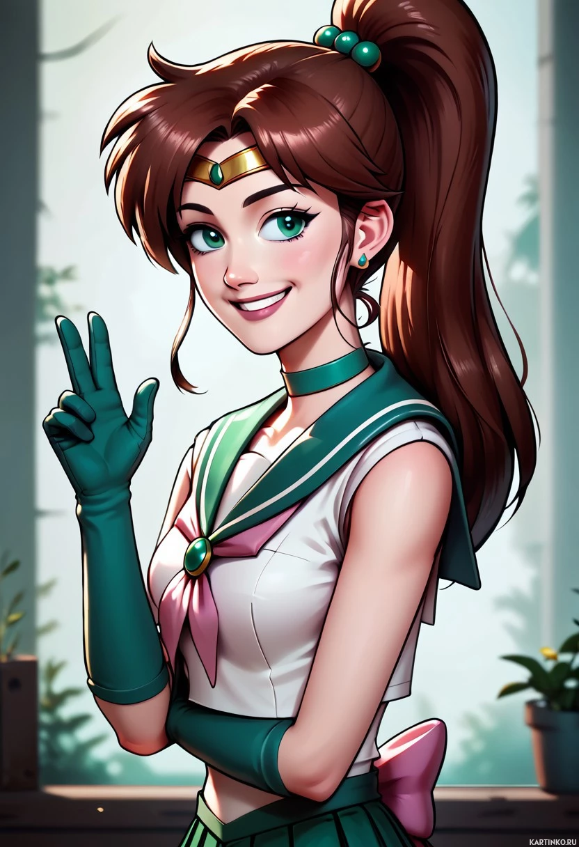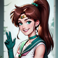 hair accessory. The character is smiling, holding up one hand in a peace