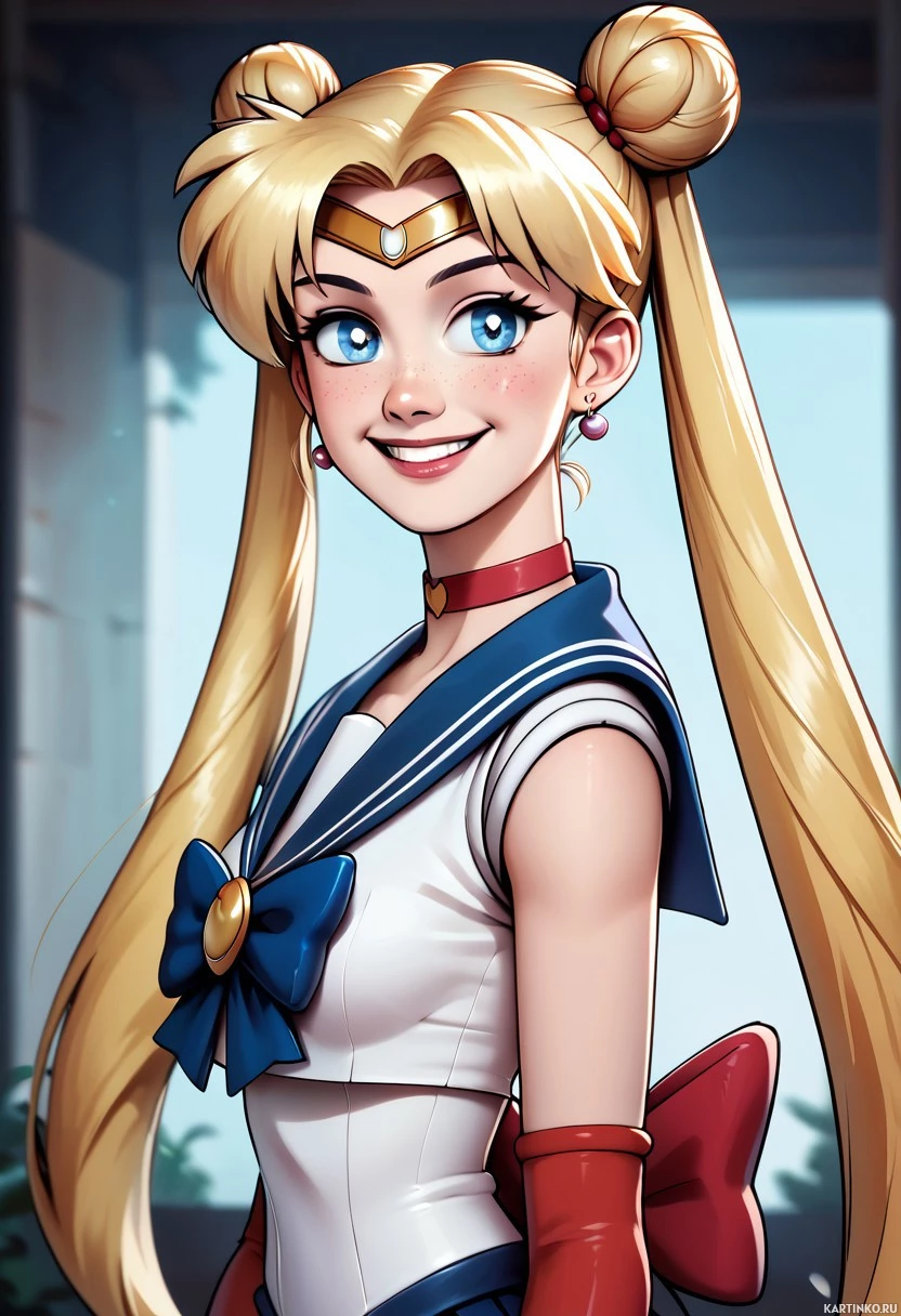 blonde hair adorned with twin tails and a red bow at the center, as well as her crescent moon necklace. Her outfit consists of a white sailor suit with blue trim, including