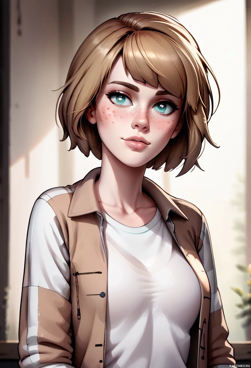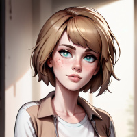 natural light coming through windows or blinds that are out of view. The style of the image suggests it could be related to a game or animated series due to its artistic quality and character design reminiscent of