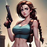 brown hair tied in a braid, and her expression is confident as she points a pistol towards the viewer. The girl is wearing