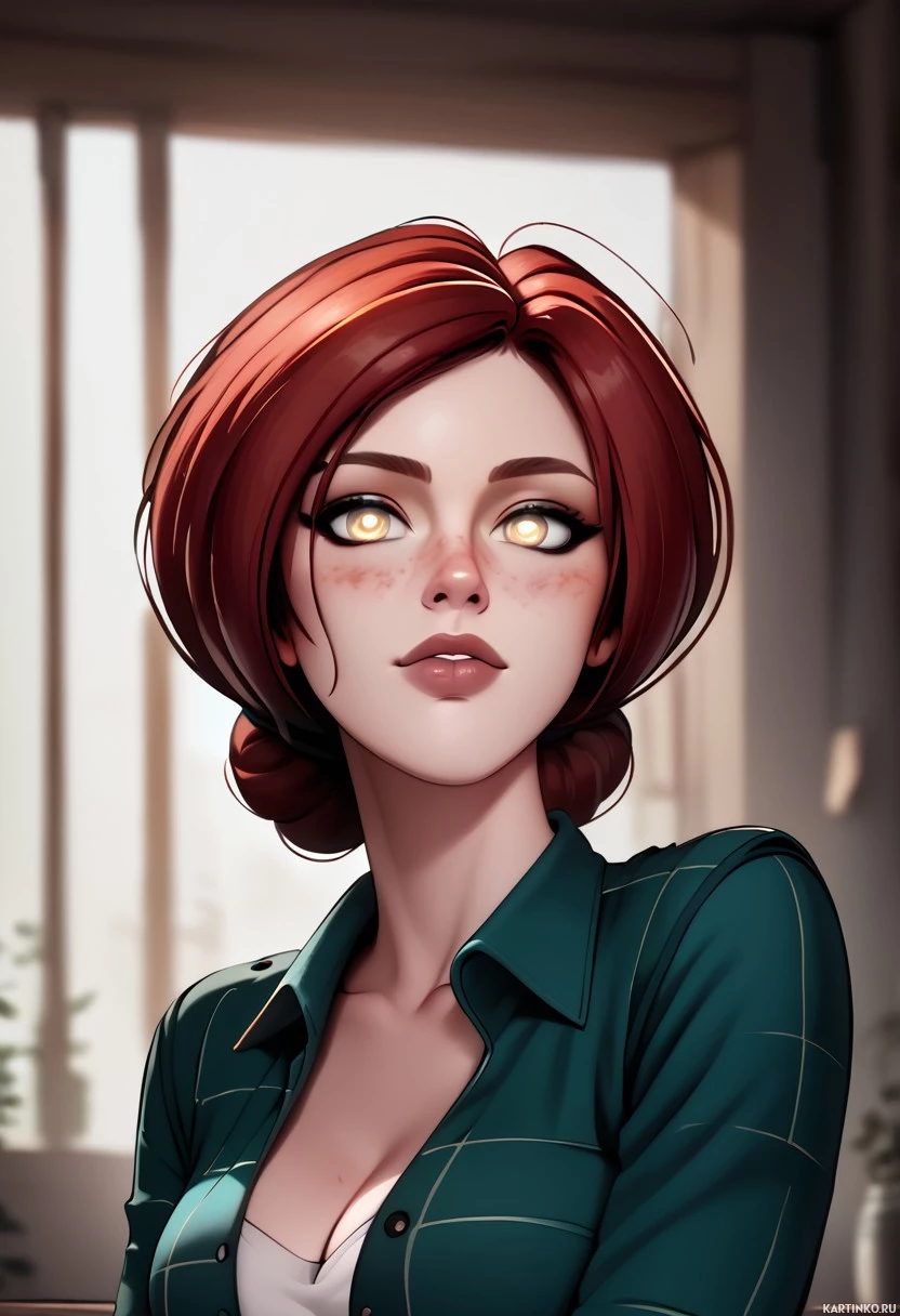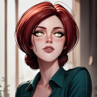 character design is reminiscent of those found in graphic novels or video games, particularly resembling characters from "The Witcher" series, such as Triss Merigold. The setting suggests an indoor environment with