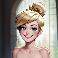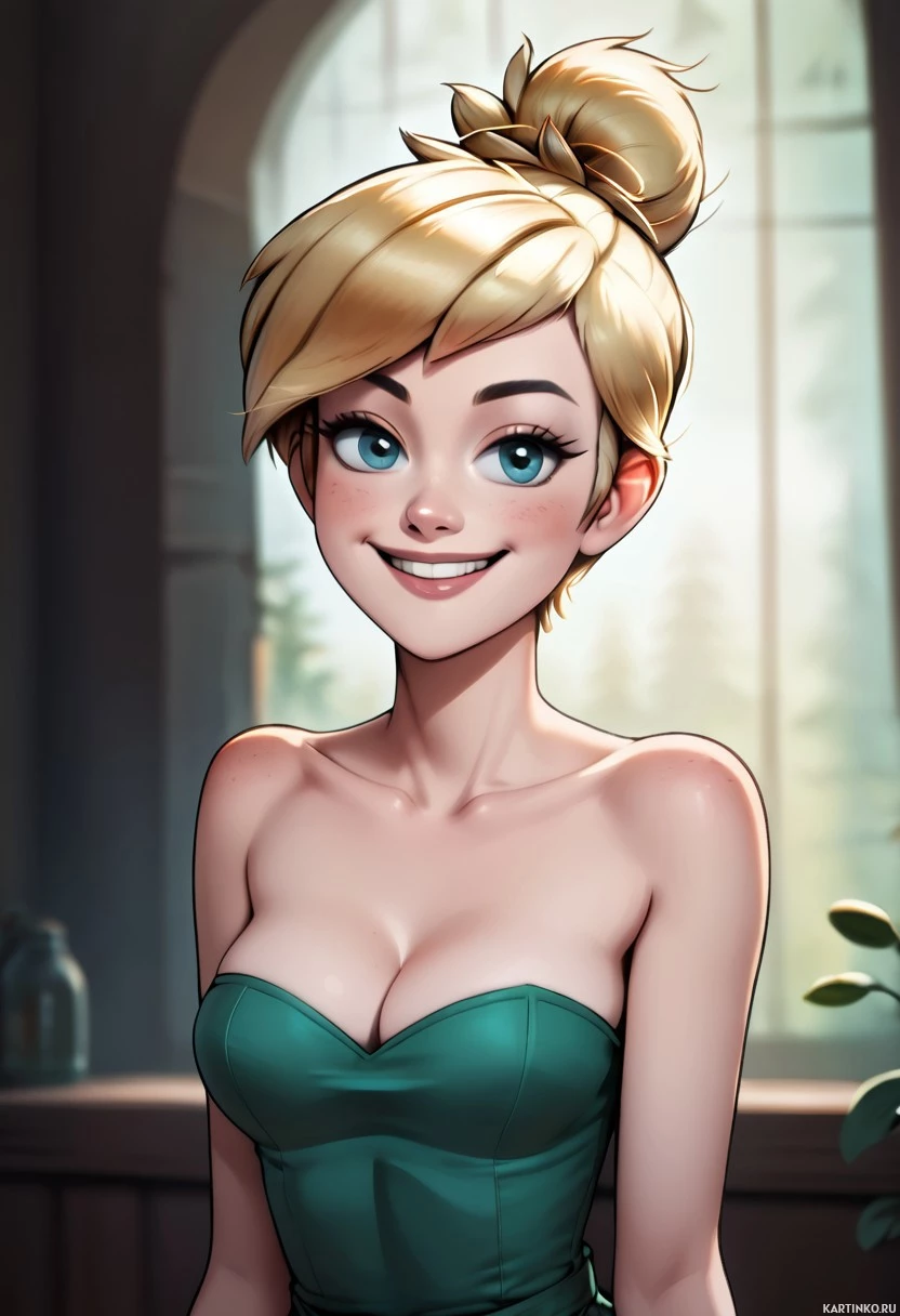 female character with blonde hair tied up in a bun. She is smiling and looking directly at the viewer. Her attire consists of a green top and she has