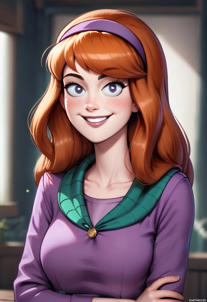 cheerful expression and friendly demeanor could indicate she is from an animated movie, possibly aimed at a family-friendly audience.