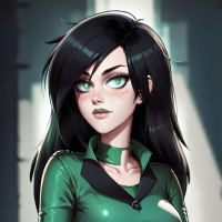 female character with brunette hair and green eyes. She is wearing