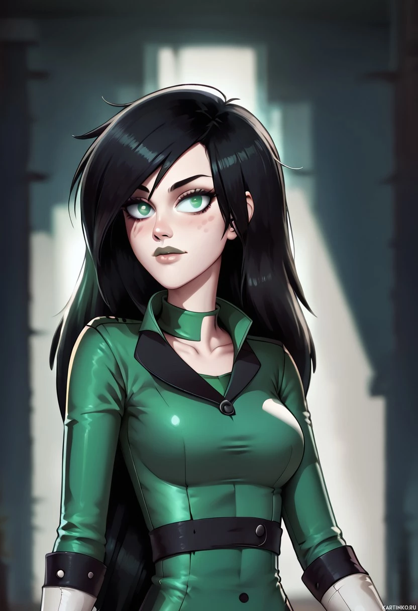 a green jacket or uniform that has black straps across her chest. Her expression seems contemplative or thoughtful. The background suggests