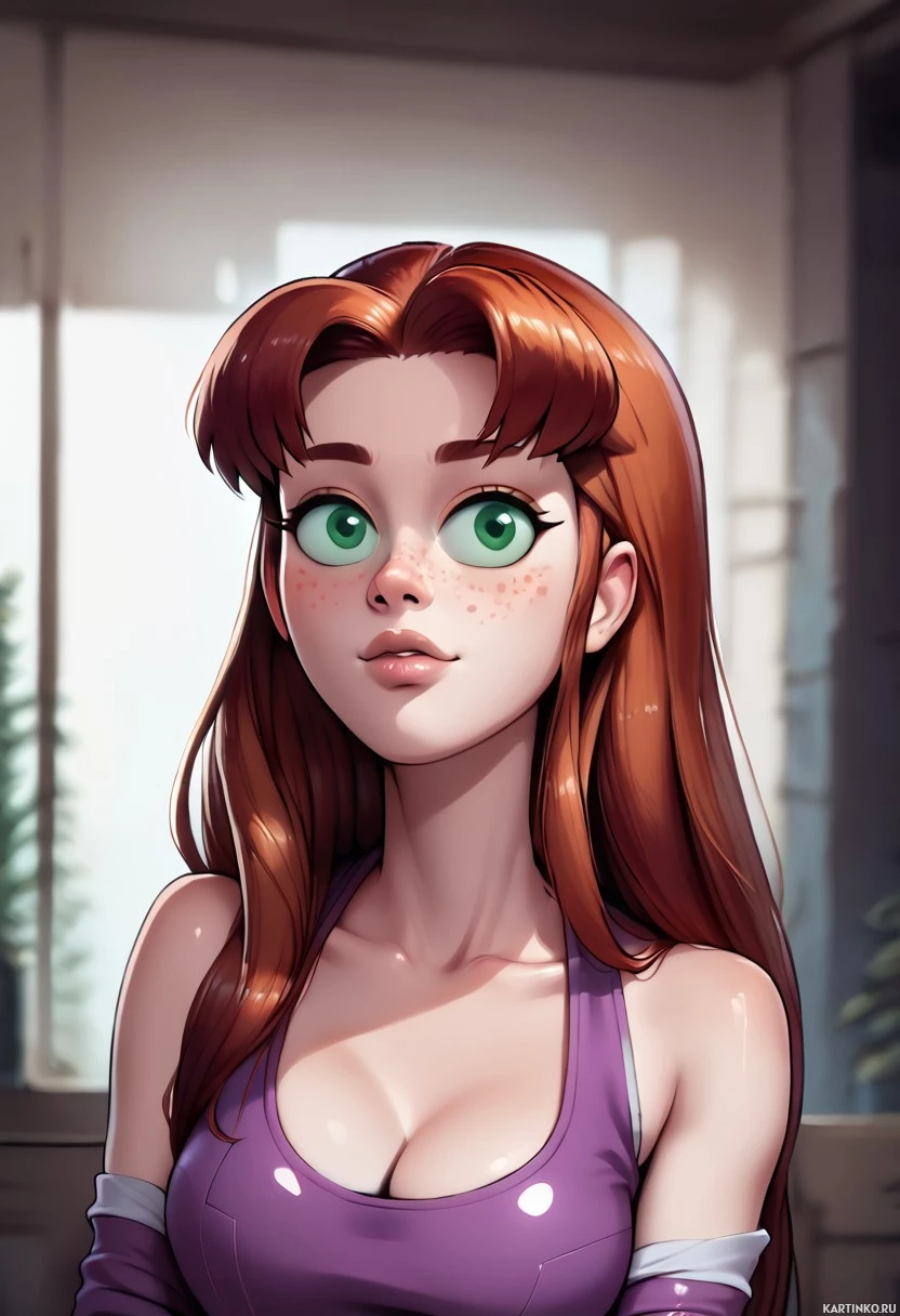 a purple top. Behind her, there's a window with daylight coming through, suggesting that the scene might be set during the day. The art style suggests this could be from an animated