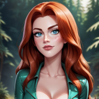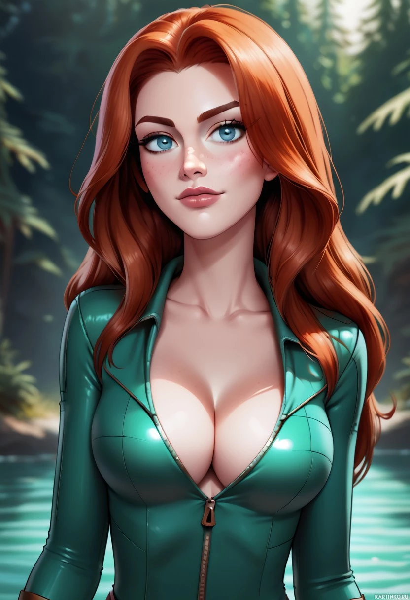 full lips and is wearing a green outfit that resembles a bodysuit or a wetsuit, which suggests an adventurous or aquatic theme. Her pose is confident and she appears to be in