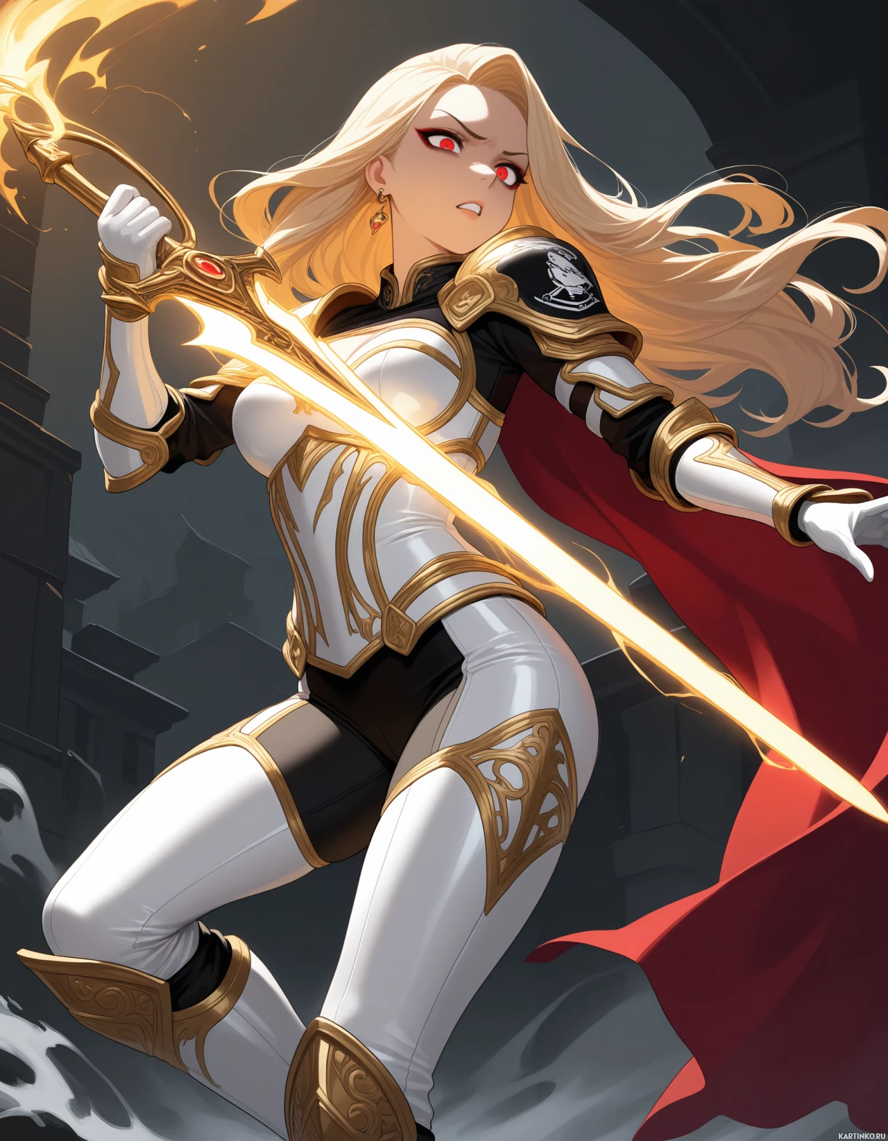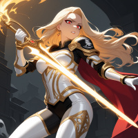 red eyes, which gives her a somewhat intense or supernatural appearance. She's wearing armor that suggests she might be a warrior or heroine of some sort. Her attire includes gold details and a cape, which adds to