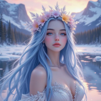 a floral wreath or crown, which includes what appears to be frost-covered flowers, suggesting a winter theme. Her eyes are closed in