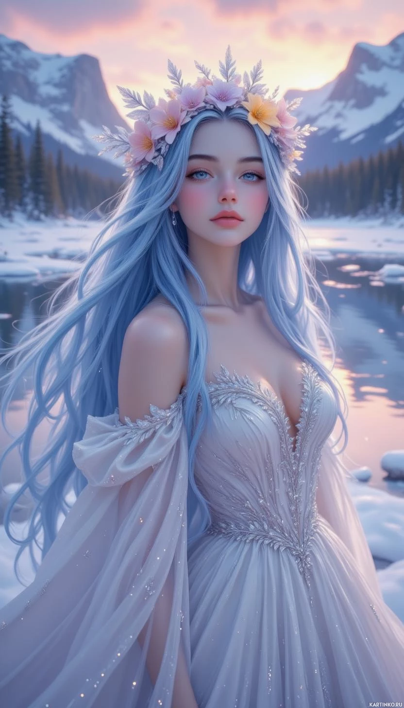 blue hair. The dress's sleeves are translucent, allowing for the view of her hands clasped together in front of her. The background depicts a tranquil winter setting, possibly a lake or river surrounded by snow-covered mountains under