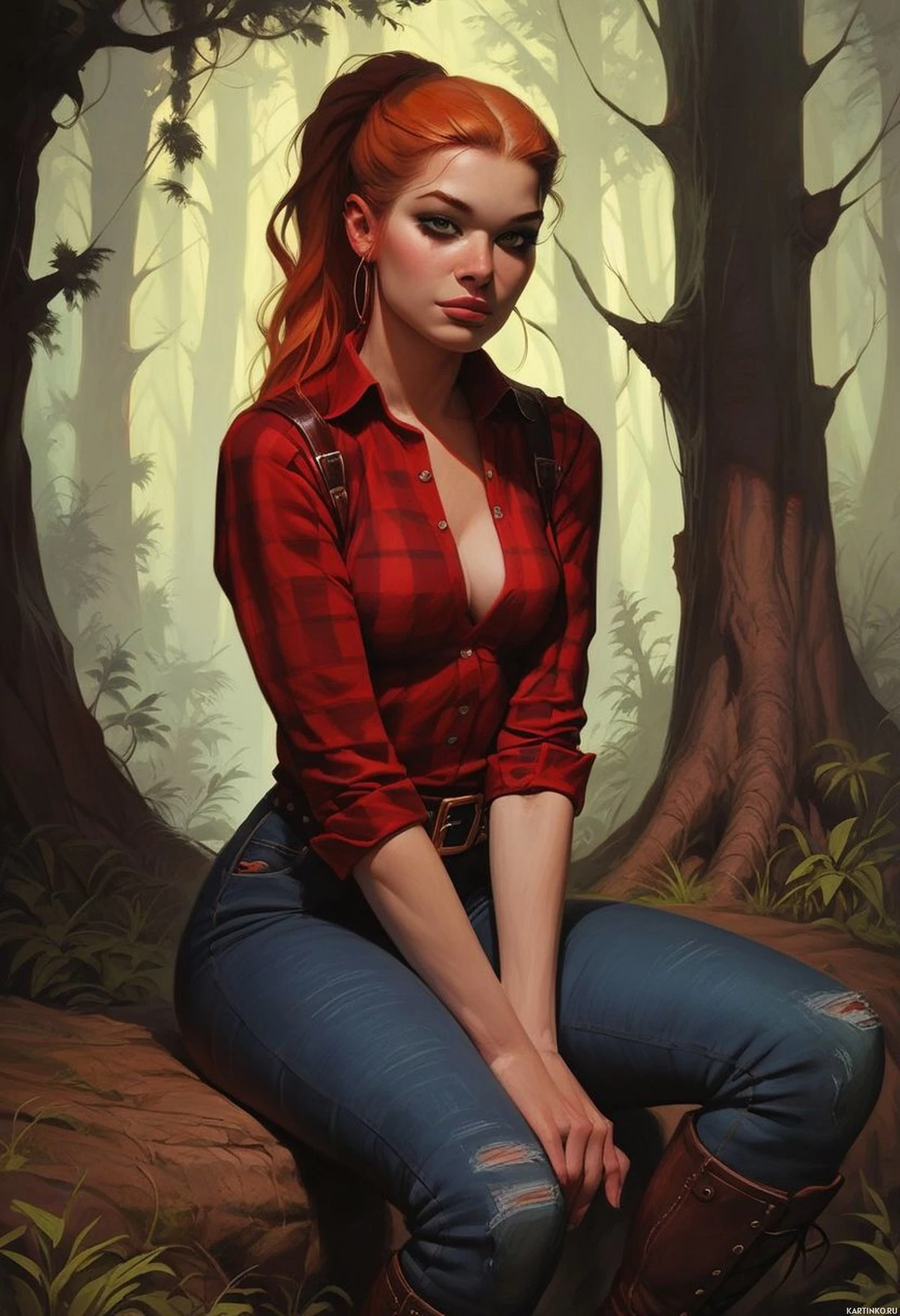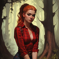 red hair styled in loose waves and is wearing a plaid shirt, blue denim jeans with distressed areas, and brown boots. Her expression is contemplative, as she gazes off to the side, away from the viewer. The background features tall trees with