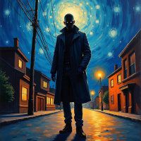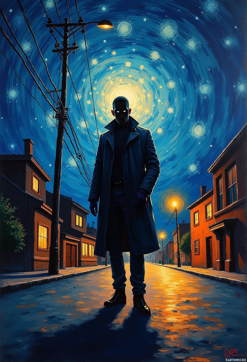 night scene. In the center stands a man, dressed in