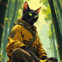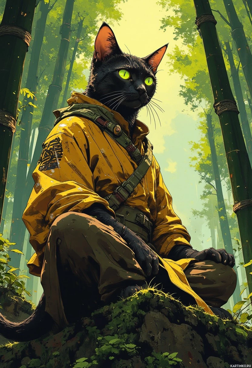 forest scene with bamboo stalks and lush greenery. The artwork presents a fantasy-like quality that merges human characteristics with