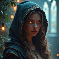 a hooded cloak or robe, and there are embellishments that could suggest magical or mystical elements to her character. The background is blurred but it appears to be