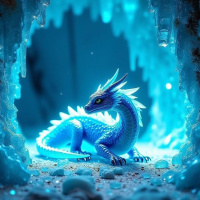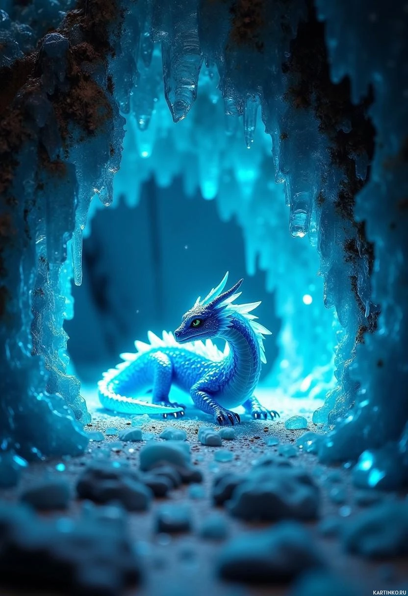 a fantastical scene of an ice cave with icy blue and white hues. Inside the cave, there is a dragon-like creature perched on rocks at the center of the frame. The creature has a colorful body with shades of blue, green, and purple, along with