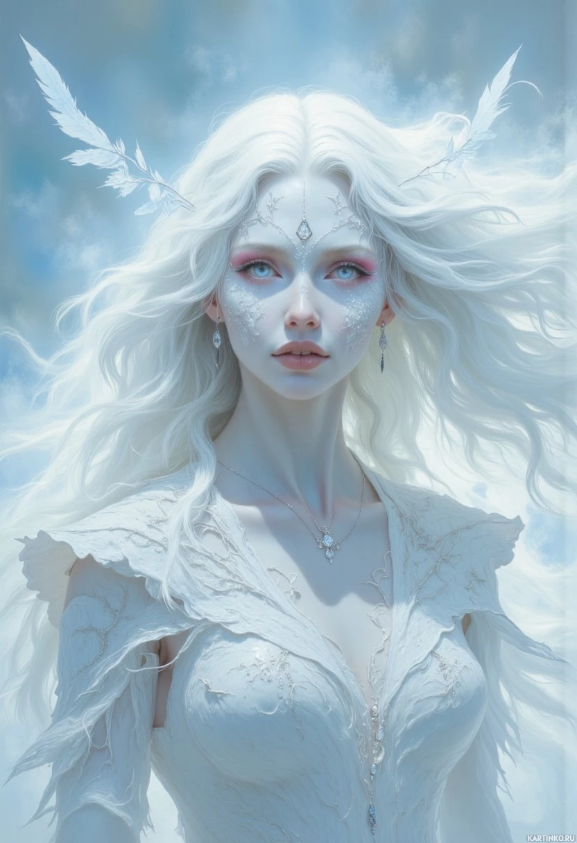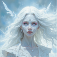 pastel hues, providing a contrast to her pale features and enhancing her ethereal appearance. She is dressed in what appears to be a detailed costume that includes elements of feathers or wings, possibly indicating she is meant to represent an angelic or magical entity.