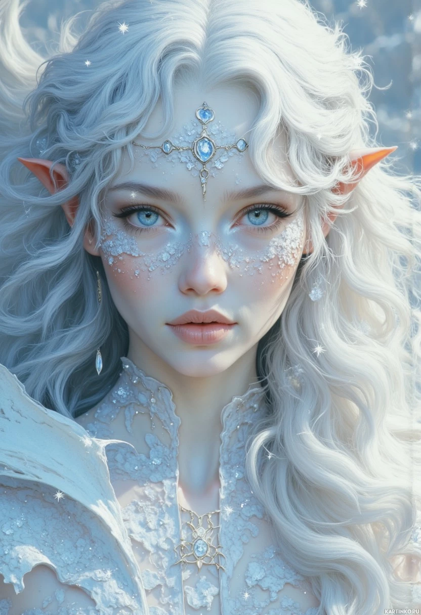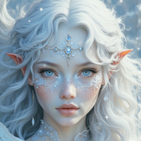 white hair and pointed ears, which are characteristics often attributed to elves in folklore and fantasy genres. The individual is adorned with intricate