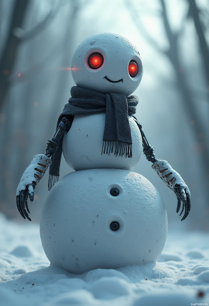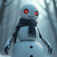 robotic parts, featuring mechanical joints and wires that are visible against the white surface of the snowman. The head of the snowman retains its traditional design, but it is also adorned with a pair of