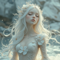 white hair that falls over her shoulders and down her back. Her skin appears pale, which may be due to