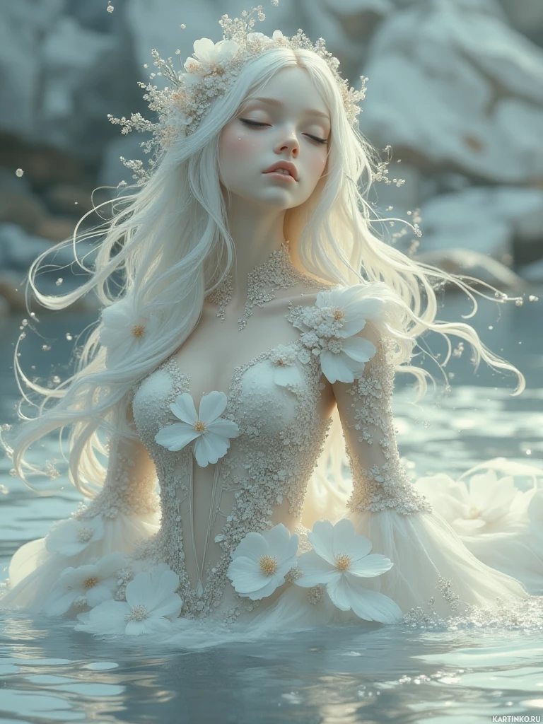 floating platform near water, with ripples visible around it. Her expression is calm, and the overall mood of the image is serene and otherworldly. The colors in the picture are soft and pastel-like, which contributes to the dreamlike quality of the scene.
