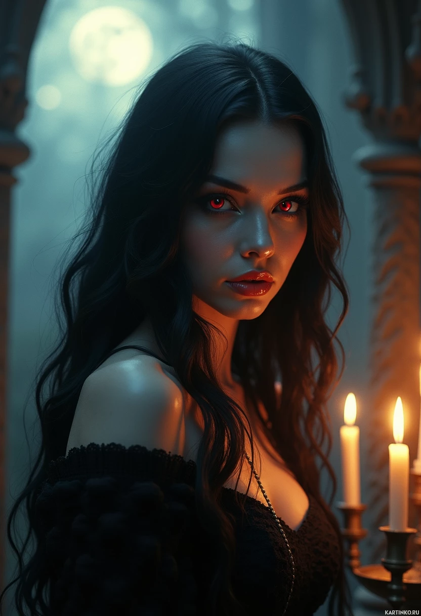 architectural structure due to the presence of what looks like an archway and candlelit ambiance in the background. The lighting is dim, with the primary source of illumination being the candles on either side of her, casting