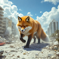 orange hue. This giant fox stands on a street filled with rubble from destroyed buildings, debris scattered around, and a cloudy