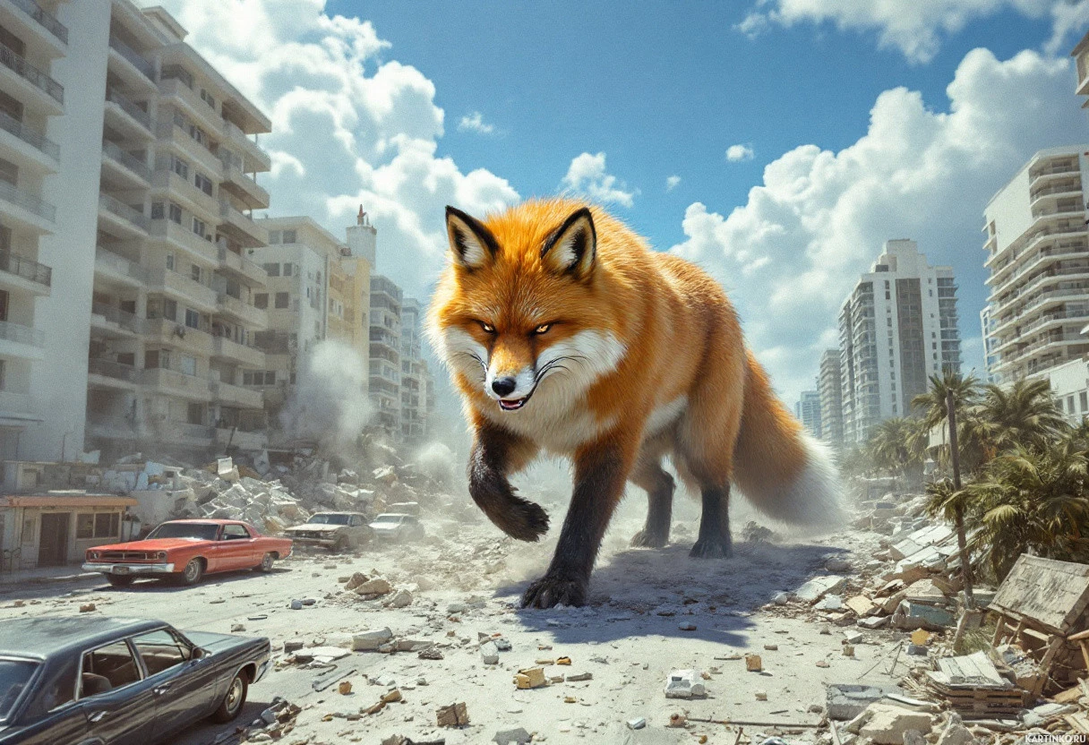 a few cars, adding to the sense of devastation. The fox is facing towards the viewer, and its expression seems intense or even aggressive, emphasizing its monstrous size in comparison to