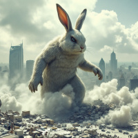 clouds of smoke rising from a source below the bunny's feet, contributing to the sense of devastation. The overall effect is surreal and intended to be humorous or thought-provoking rather than realistic.