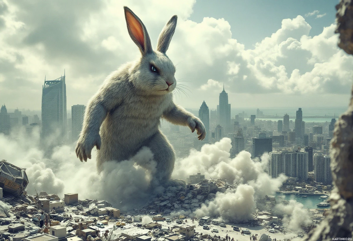a post-apocalyptic scene with a colossal bunny standing amidst destruction. The city around it appears to be in ruins, with debris and rubble visible all around. The rabbit is not realistic in size; rather, it has been digitally manipulated or inserted into the image to create an absurd,