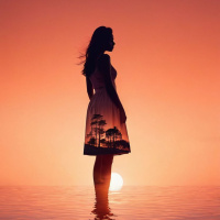 warm tones that suggest either dawn or dusk. The woman's stance and