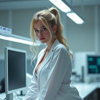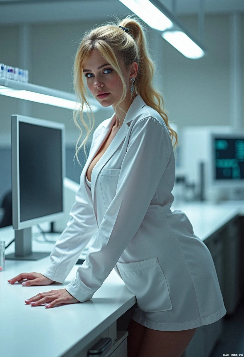 lab coat, suggesting a professional or scientific setting. Her posture is relaxed as she leans casually on the countertop. The background indicates