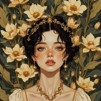 delicate fabric, and she wears a crown-like accessory on her head that adds to the royal or noble appearance. The background consists of an array of flowers and foliage, predominantly featuring sunflowers. These elements together create a floral backdrop that envelops the central figure, contributing to the overall