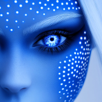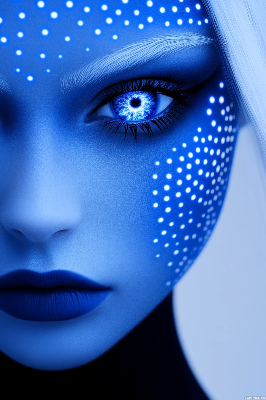 The image features a person with a digital or artistic alteration, giving them an appearance that is not entirely natural. The skin tone appears to be blue-toned, which could suggest a filter applied in post-processing for a certain aesthetic effect. There are small white dots or markings covering the person's face and extending onto their head, possibly suggesting a digital transformation or