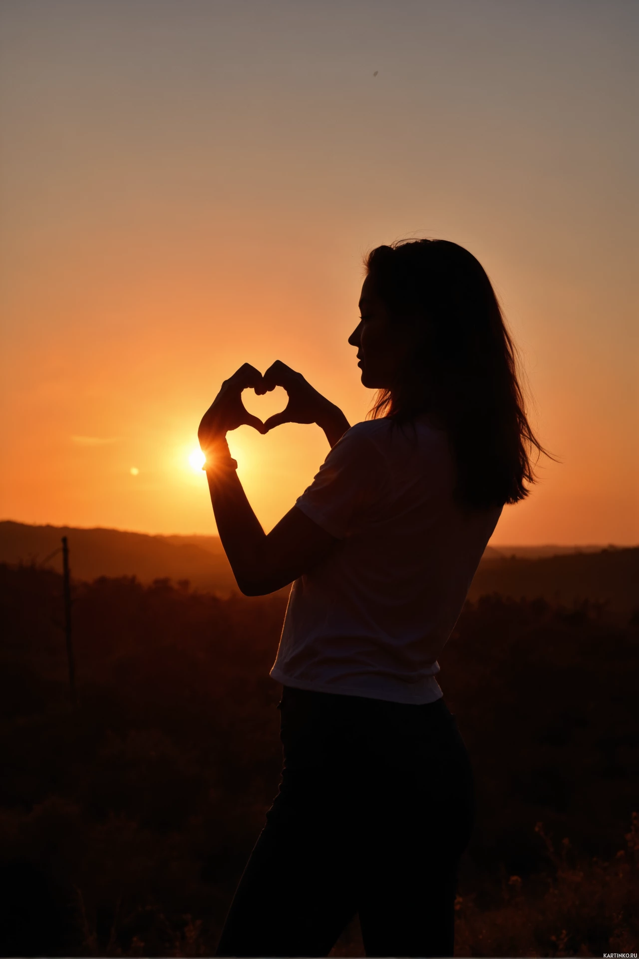 На картинке изображен силуэт женщины, стоящей на фоне вечернего неба, где виден заходящий за ее спиной закат. Она стоит спиной к камере, ее руки вытянуты вперед, образуя руками в форме сердца. Ее тень на земле вытянута из-за угла падения солнечных лучей. Кажется, что место очень спокойное, и это можно интерпретировать как момент размышлений или как запечатленный в золотой час праздник.