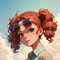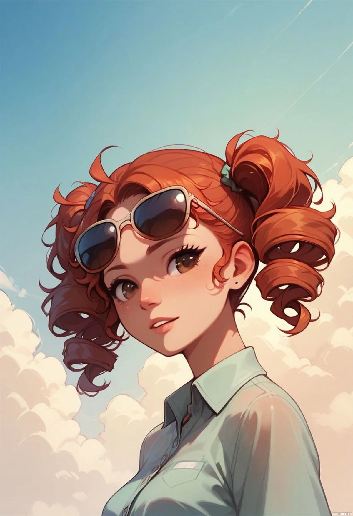 На картинке изображен персонаж, нарисованный в иллюстрации. У нее рыжие волосы, и она носит солнцезащитные очки, скорее как модный аксессуар, чем для защиты от солнца. Стиль рисунка указывает на то, что это может быть кадр из комикса или графического романа.