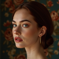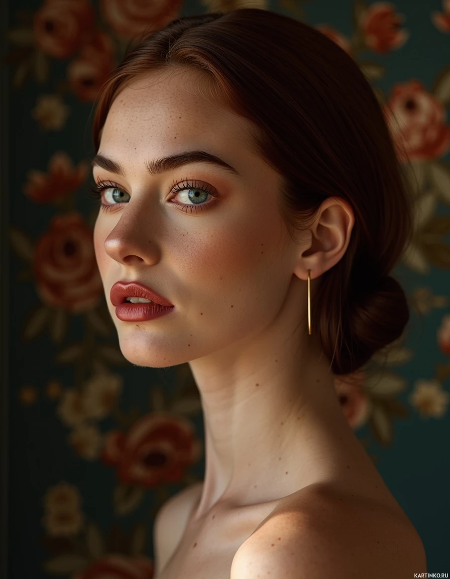 wavy hair and is wearing makeup that includes defined eyebrows and what looks like a subtle contour around her eyes. Her lips are slightly parted, and she seems to have a neutral or gentle expression on her face. She is wearing a pair of gold-colored earrings that hang from her lobes. The woman's complexion is fair, and she has a few visible freckles scattered across her face, which adds to her