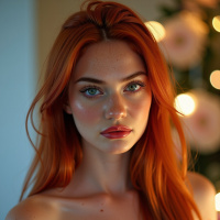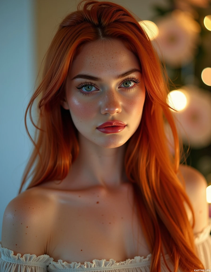 red hair. She is wearing what appears to be a white, embellished top with ruffled sleeves, and her hair has