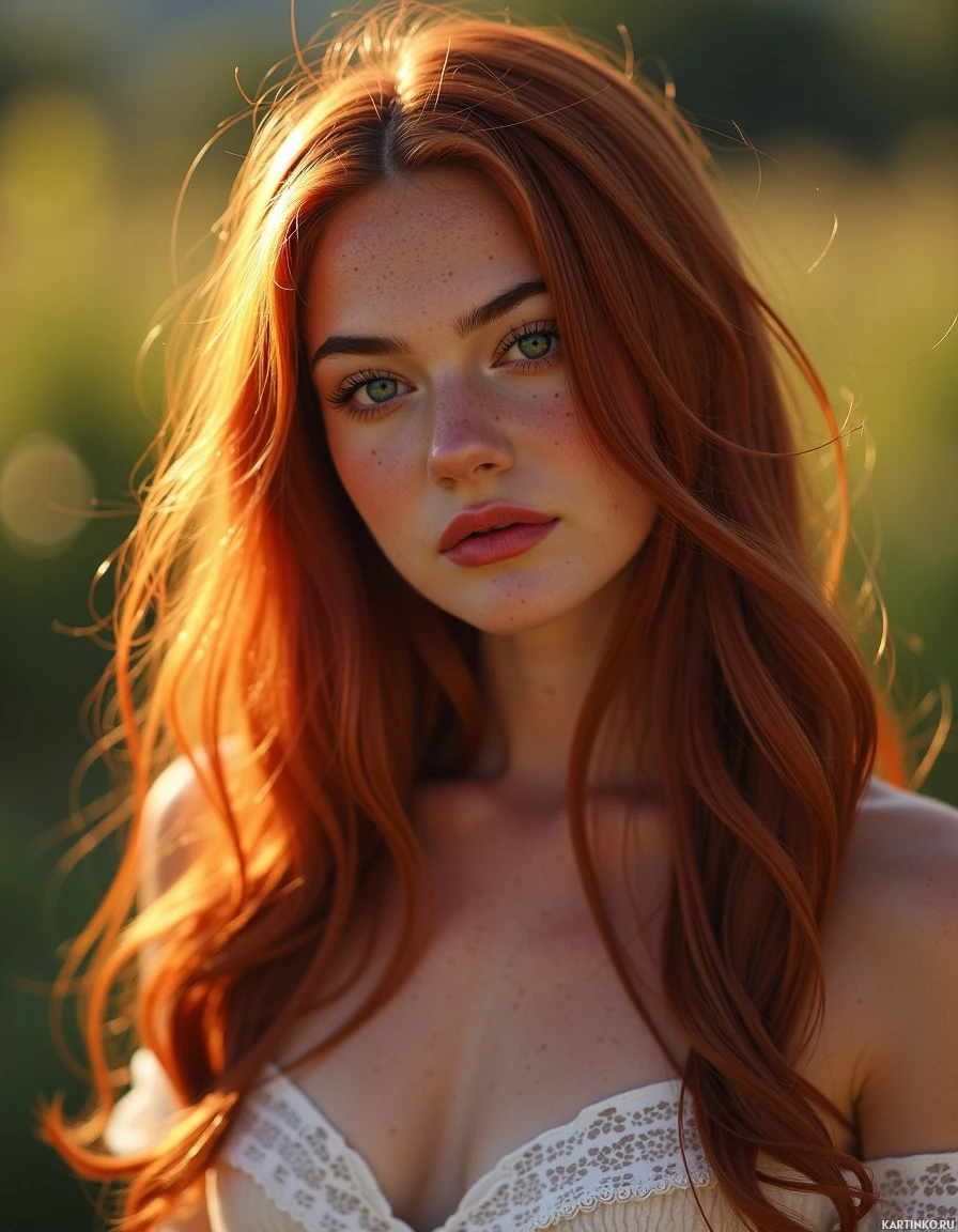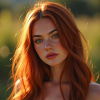 makeup look with subtle highlighting and lipstick that matches her hair color. Her eyes are open and she is looking directly at the camera with