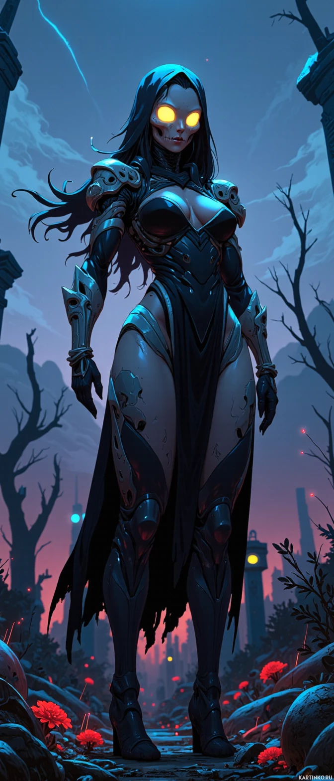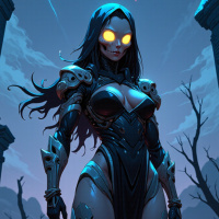 body armor or suit of black and silver that has a skeletal design, suggesting a theme related to death or the undead. In her right hand, she holds a staff with a skull at its head, which further emphasizes the dark fantasy theme. The setting appears to be a gothic or horror-themed