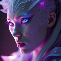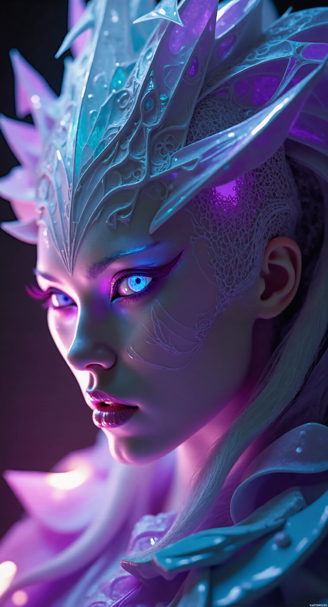 eye shadow, detailed eyeliner, and her lips are painted with shades of purple and blue. Her facial structure is accentuated by sharp, angular lines, giving her