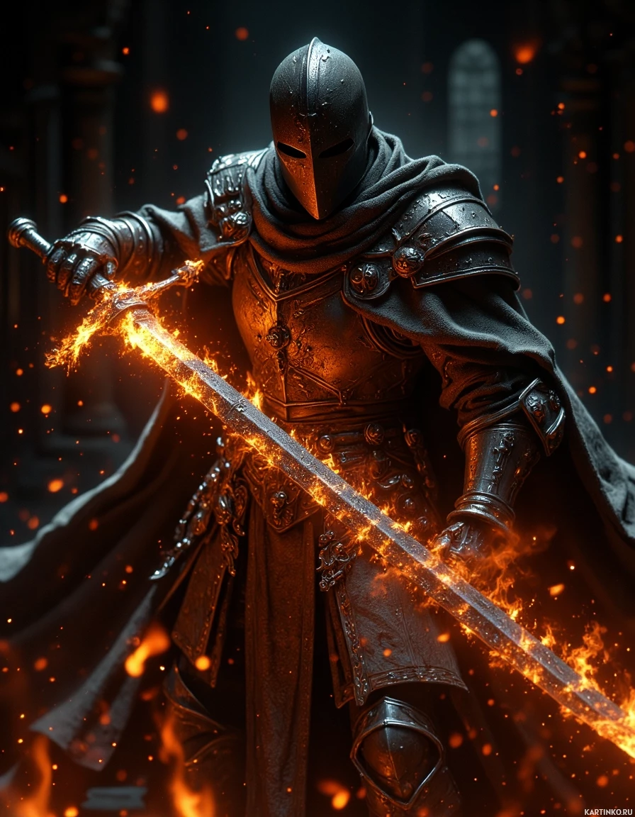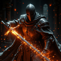 medieval armor, standing with a sword drawn and held firmly. The armor is ornate, suggesting