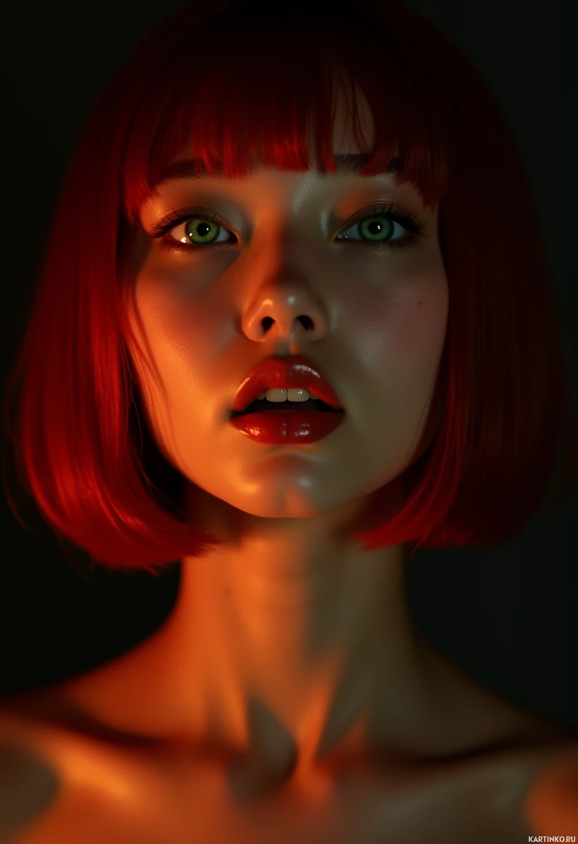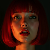 red hair that is styled in a short bob. Her makeup features bold, bright