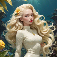 metallic outfit that gives her an almost mermaid-like appearance. Her attire has a shiny, reflective quality to it, suggesting a high gloss or polished finish. The background of the image depicts a fantastical