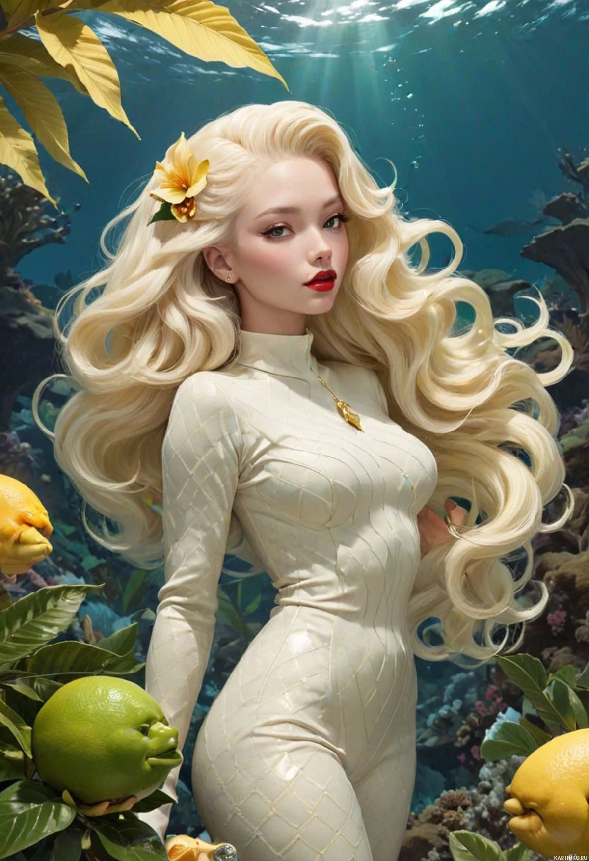 underwater scene with various aquatic plants and a fruit tree visible in the foreground. The style of the artwork is realistic with