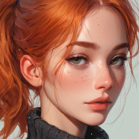 a young woman with red hair tied back, and her eyes are looking slightly to the side. She has a subtle blush on her cheeks and is wearing what appears to be