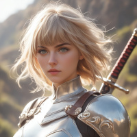 combat gear. She holds a sword in her right hand, pointing it downwards. The background suggests a rugged,