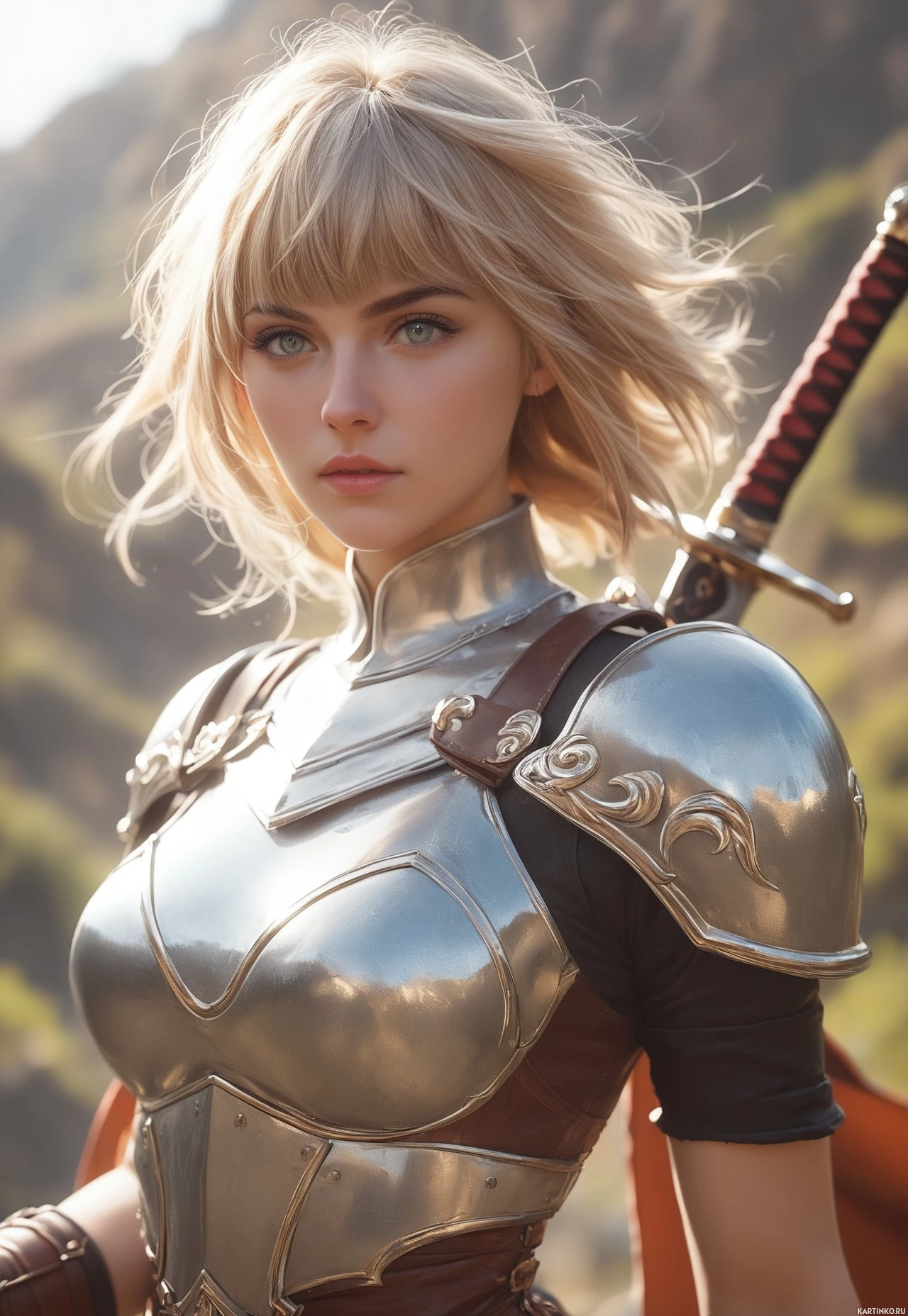blonde hair that is pulled back, and she wears a helmet with a visor up, revealing her face. Her expression is neutral as she gazes directly at the camera. The armor includes breastplates, gauntlets, and thigh guards, with visible embellishments and straps suggesting a functional piece of