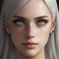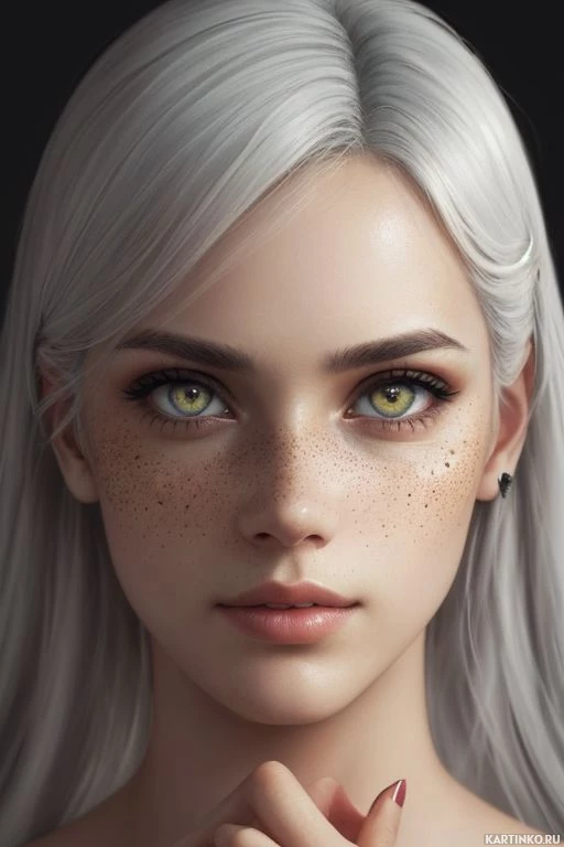a young woman with white hair, which is part of her natural coloring. Her facial features are highlighted with makeup that includes